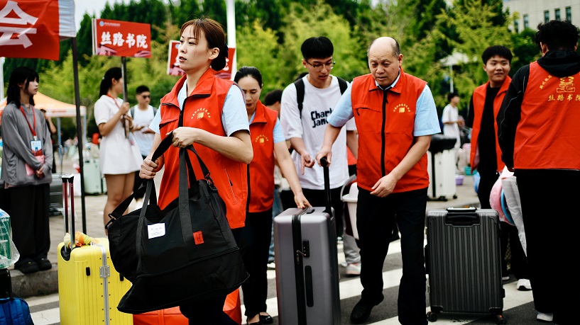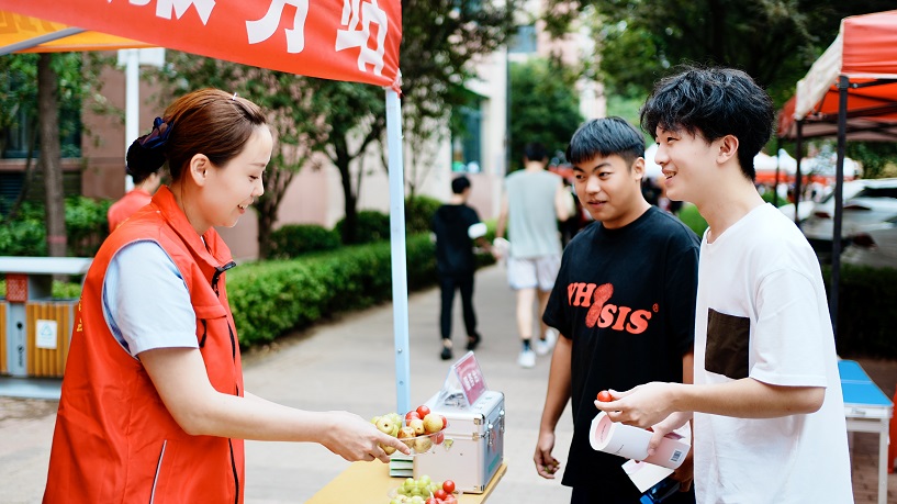 宿管员在爱心站点内热情地解答新生们的问题值班员认真细致的为新生发放各类物资;维修工值守在接待现场,随时准备解决突发问题。