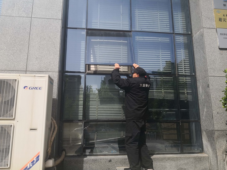 保洁员工一层层的楼道窗户逐个关闭,以防被大风刮坏,脱落;