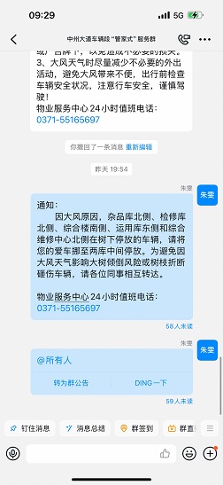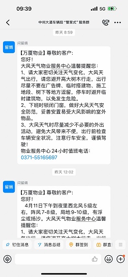 客服部管家园区楼栋巡检,发送温馨提示,提醒每位业主客户做好预防工作。