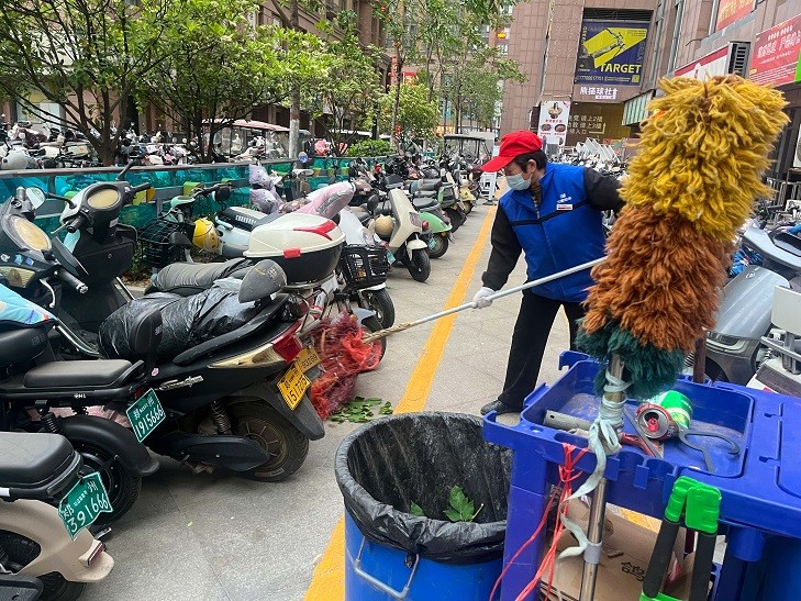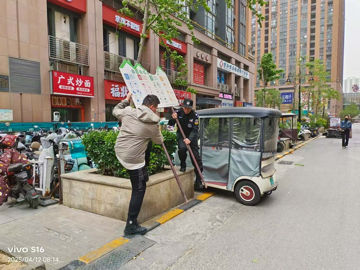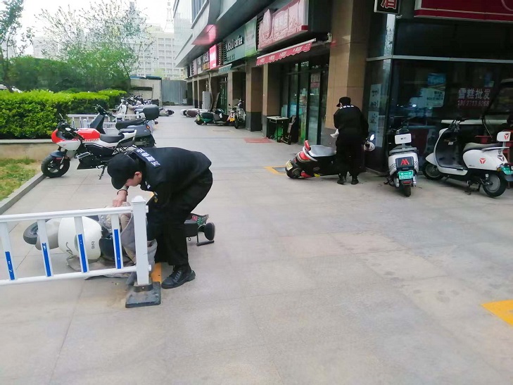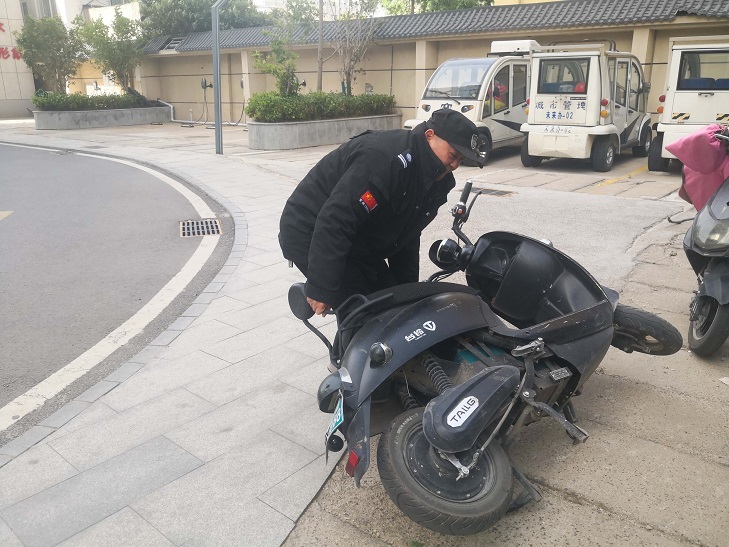 不仅如此,路边的电动车也被大风刮倒在地。万厦物业工作人员发现后,立即上前查看情况,顶着大风将一辆辆倒地的电动车扶起,并推至安全地带,确保道路畅通无阻。