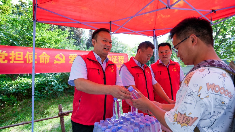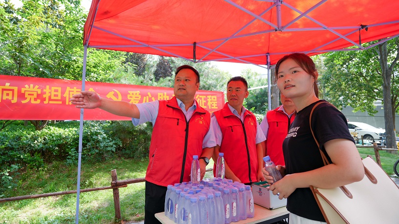 活动现场,党员们身着统一的服装,面带微笑,以饱满的热情投入到志愿服务中。他们不仅为考生递上清凉的矿泉水,缓解紧张与炎热,还主动为考生和家长指路,确保他们能够顺利找到考场位置。